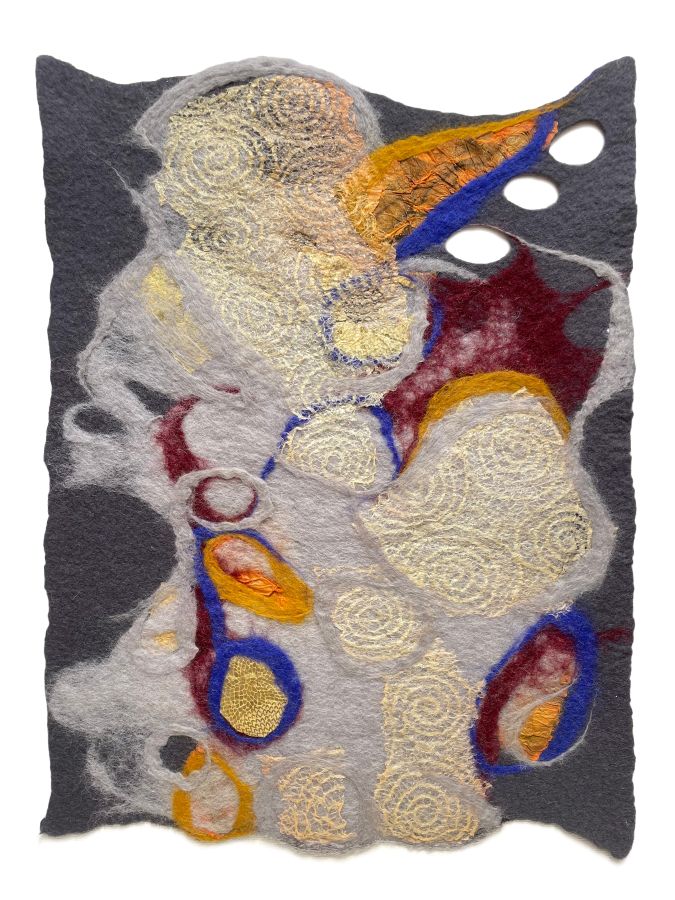 I work primarily with natural fibers—wool, silk, and found textiles—materials that hold history, fragility, and strength. I love to spread and open these old textiles, allowing them to breathe again and reconnect with nature, where all fibers originally belong. Through felting, using only water, soap, and movement, I bind materials together much like memory itself.