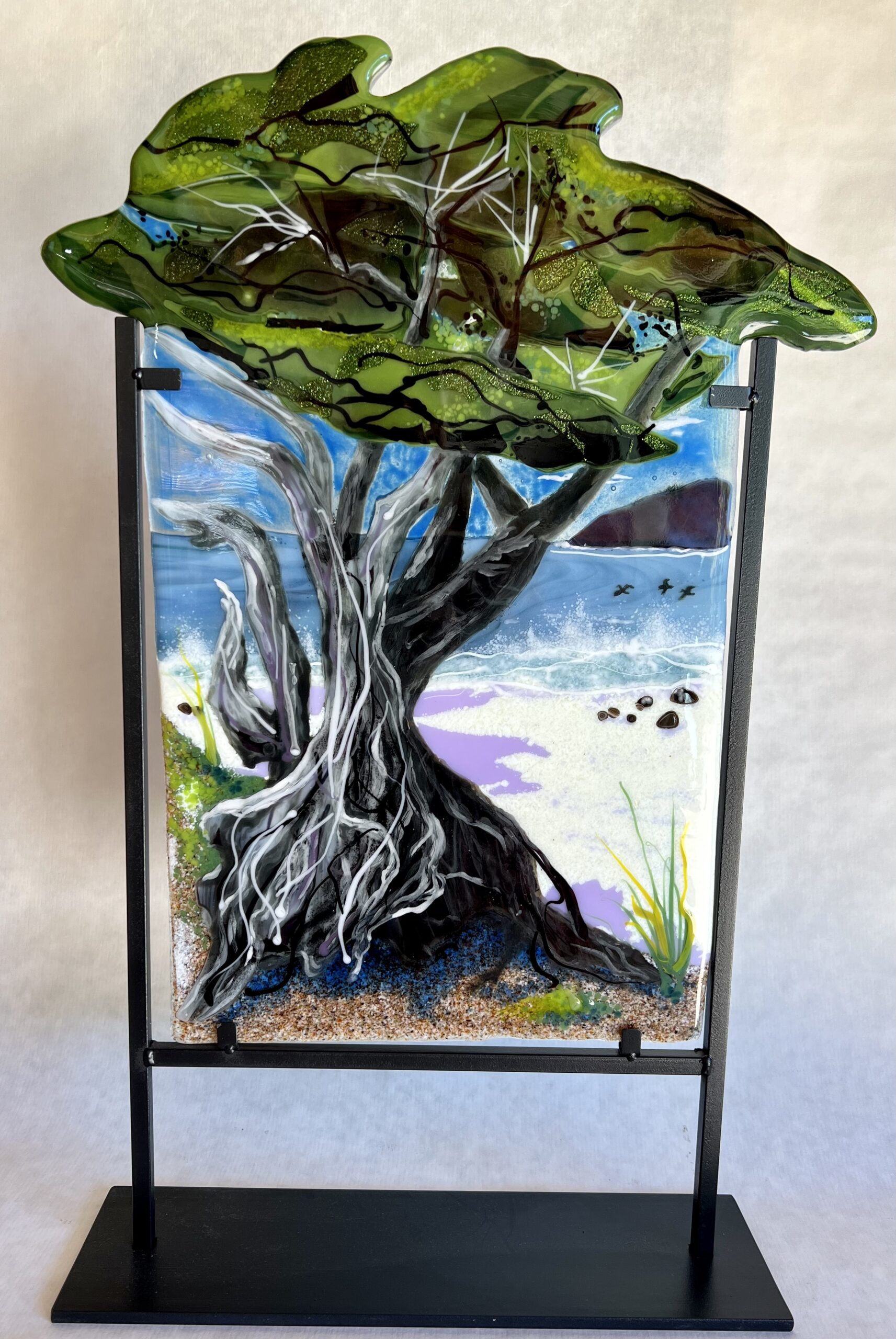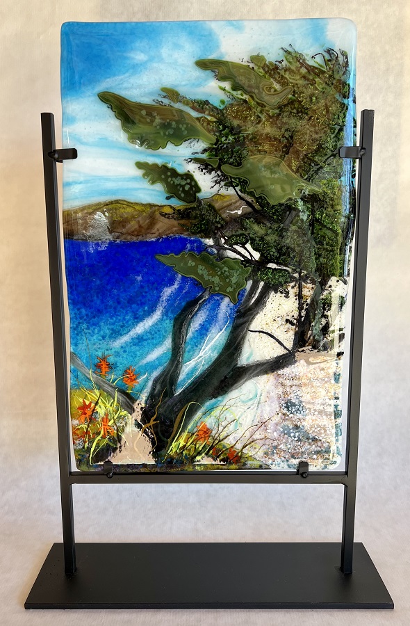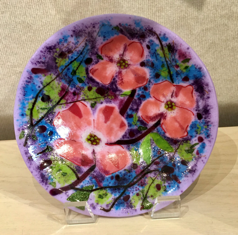 Nancy became interested in fused glass after taking a community college course. When her first piece came out of the kiln she said she had been hooked. Special fusing glass is cut, washed and reassembled. Frits (crushed glass ) and stringers (spaghetti like glass) are added before firing in a kiln to around 1465 degrees. She brings her skills as an oil painter and frequently adds to her pieces sometimes firing 3 or more times. Pieces that have a shape, have been slumped in another firing at a lower temperature. She has taken numerous workshops with glass artist Roger Thomas and continues to learn all she can about the art that dates back to the ancient Romans and Egyptians.