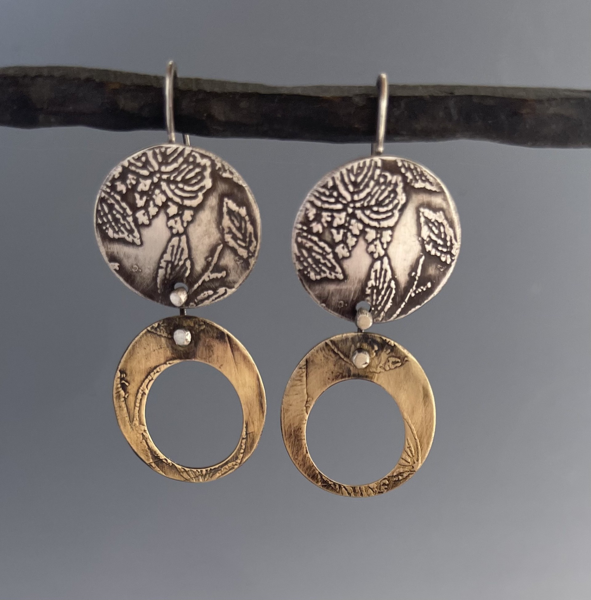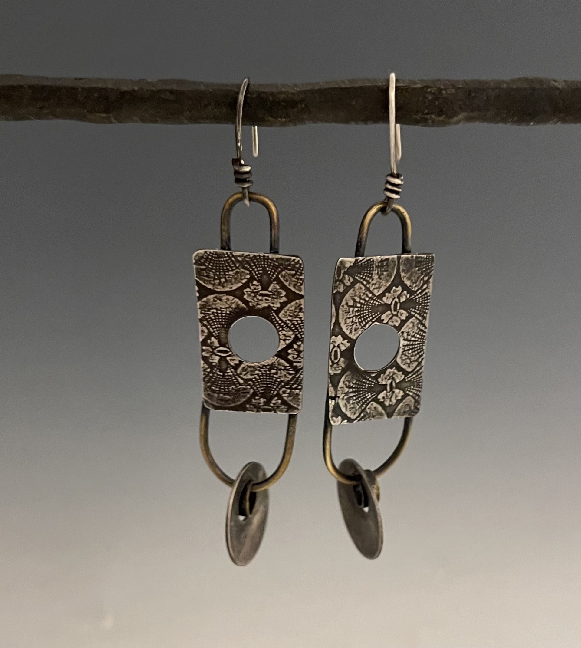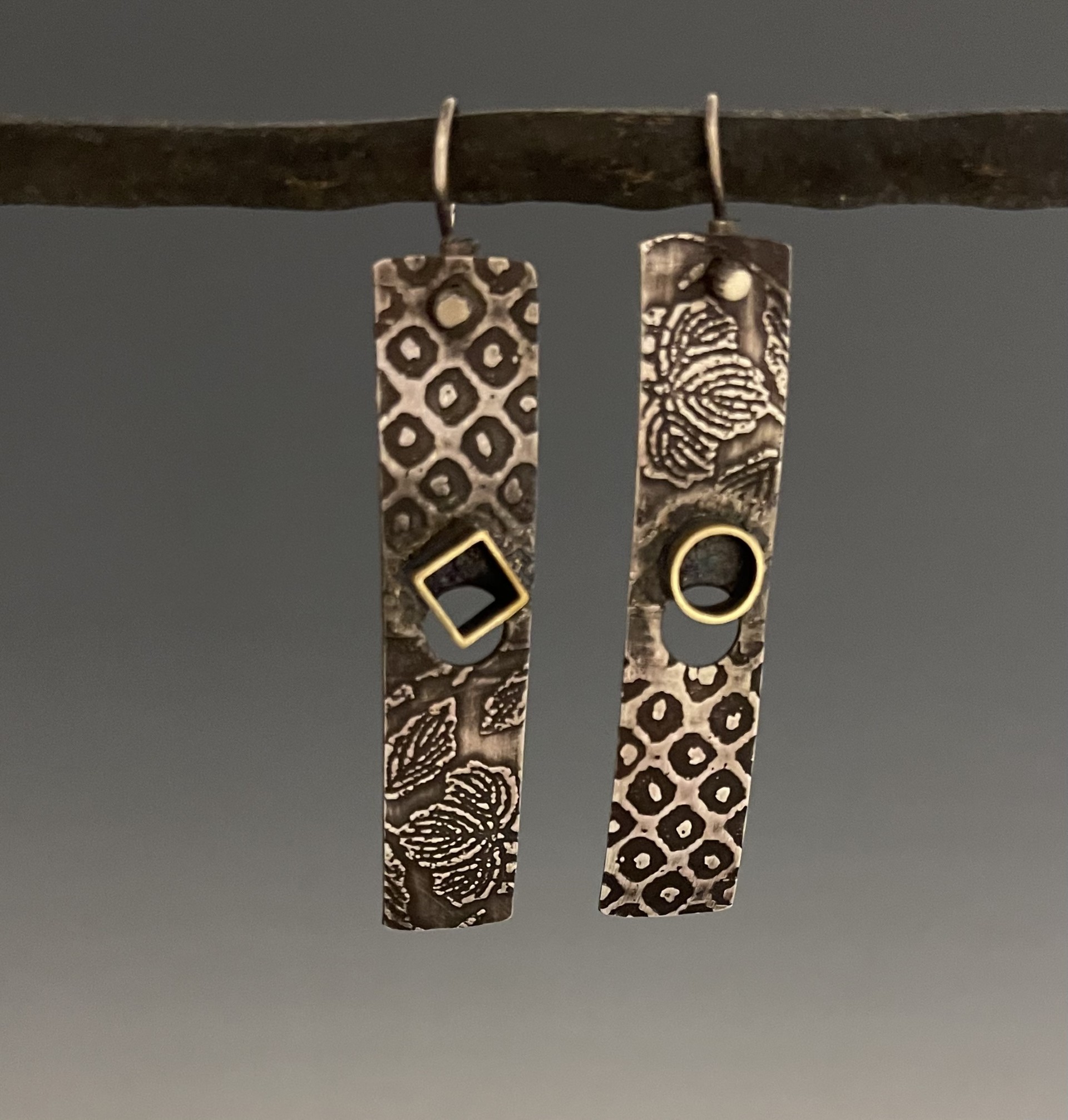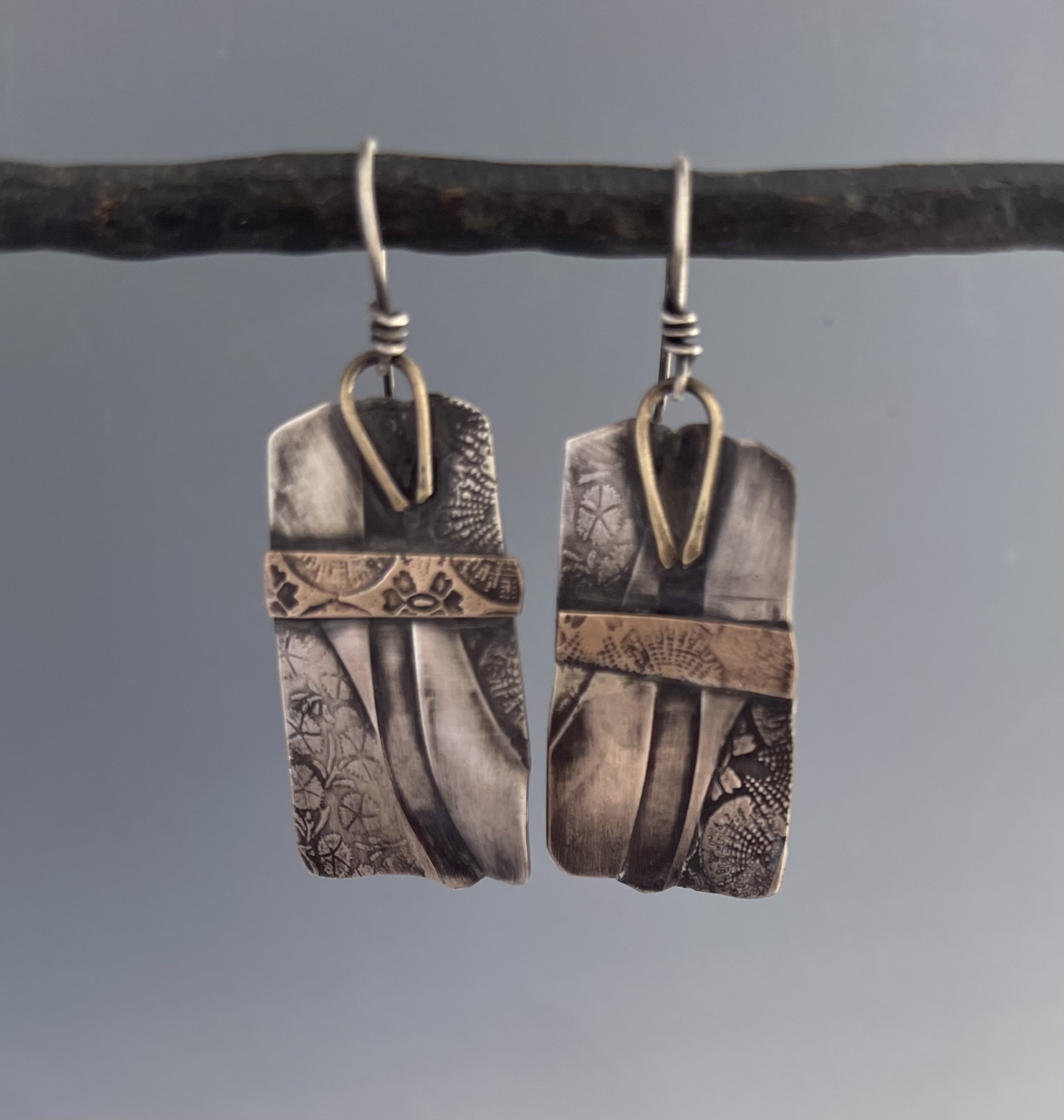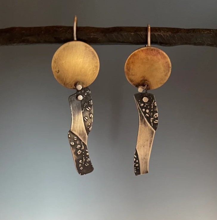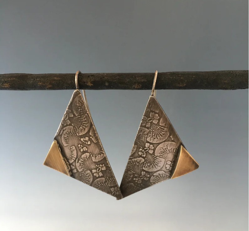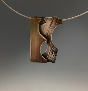Patti has a deep appreciation of the Asian aesthetic, as reflected in her jewelry. Working in Sterling silver and red brass, she often etches or roll-prints patterns into the pieces she produces. The pattern sources are many, found in Japanese culture and beyond. She also produces pieces that are enamel on copper, to add colors to her work. The designs she conceives are simple and well balanced. Each piece is fabricated by hand. (None are mass-produced.)